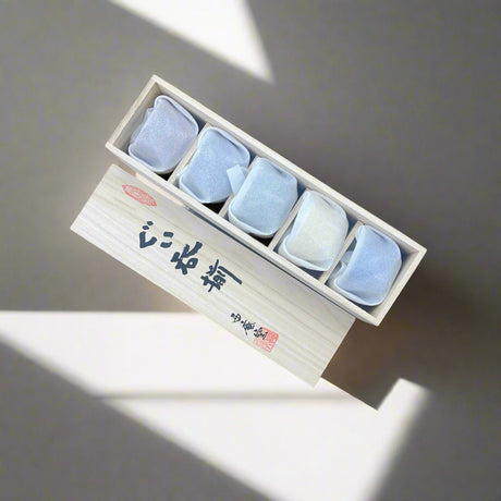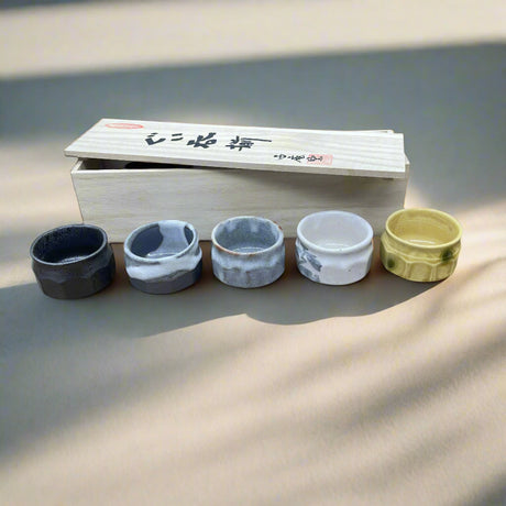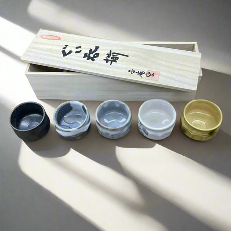 Seiangama: Handmade Mino-yaki Guinomi Cup 5 Piece Set with Wooden Box 手造り五様ぐい呑揃